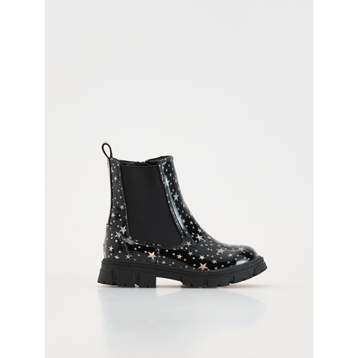 Botki o prostym kroju, wykonane z imitacji skóry.