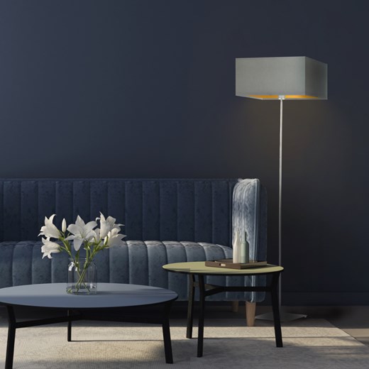Elegancka forma i wyjątkowy design lampy podłogowej z szarym abażurem ze złotym wnętrzem PRAGA GOLD