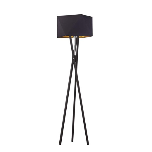 Drewniana lampa stojąca na trójnogu TULUZA GOLD z czarnym abażurem ze złotym wnętrzem