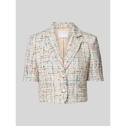 Żakiet damski Jake*s Collection;Mieszanka materiałów z dodatkiem wiskozy;Prosty krój;Imitacja bouclé;Kołnierz z połami;Listwa z 2 guzikami;Krótkie rękawy;Kieszenie z wypustkami;Długość tyłu w rozmiarze 36: 48 cm;Szerokość klatki piersiowej w rozmiarze 36: 46 cm;Długość rękawa w rozmiarze 36: 27 cm