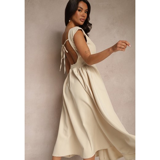 Beżowa Rozkloszowana Sukienka z Wiązaniem i Dekoltem w Kształcie Łódki Alanira