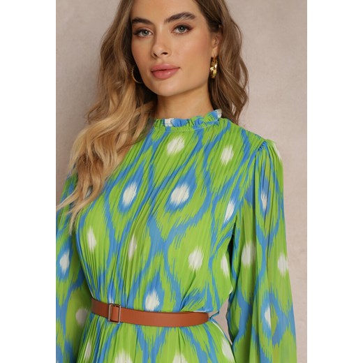 Niebieska Sukienka Ozdobiona Wzorem i Plisowaniem z Paskiem w Komplecie Bertina Renee odzież
