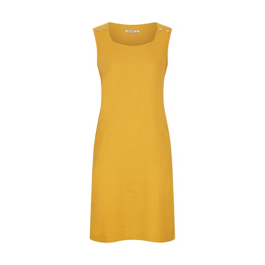 55% len, 45% wiskoza Pranie z zachowaniem ostrożności w temp. 30 °C. Nie wybielać. Nie chlorować. Prasować w temp. max do 150 °C. Nie czyścić chemicznie. Nie suszyć mechanicznie. Elegancka, lniana sukienka na szerokich ramiączkach. Dopasowany fason. Długość przed kolano. Modny, żółty kolor. Model z dwiema kieszeniami. Modelka na zdjęciu ma 173 cm wzrostu i prezentuje rozmiar 36. Dla rozmiaru 36: długość całkowita 95 cm, obwód klatki 92 cm, obwód bioder 99 cm, obwód talii 84 cm.