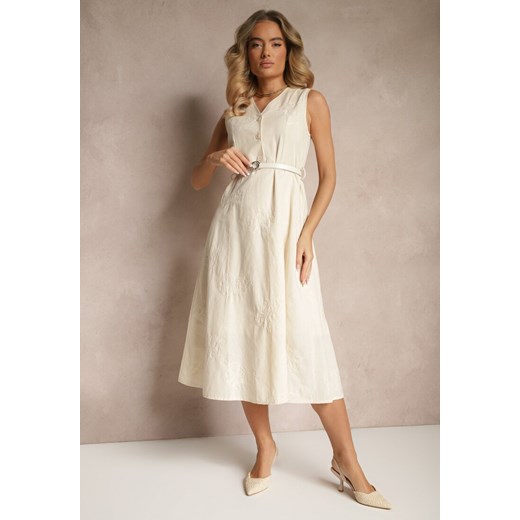 Jasnobeżowa Rozkloszowana Sukienka z Wiskozą z Paskiem i Guzikami Ulisena