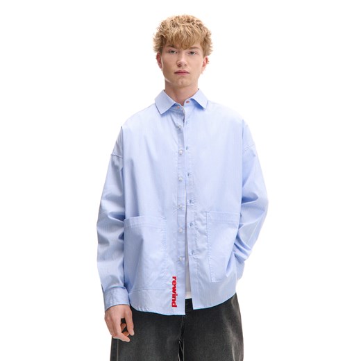 Męska koszula ze wzorem w paski, z dużymi naszywanymi kieszeniami na wysokości pasa. Zapinana na nieszablonowe guziki z napisami na krawędziach. Częściowo ukryte hafty dodają jej ulicznego sznytu.