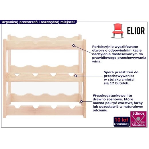 Masz mnóstwo butelek wina i nie wiesz, gdzie je trzymać? Mamy na to odpowiedź! To drewniany stojak na wino marki Eklior, który nie tylko pomieści aż 12 butelek, ale także doda uroku Twojemu wnętrzu. to idealny sposób na przechowywanie i prezentację Twojej kolekcji win, które zawsze warto mieć w pobliżu w razie nieoczekiwanych wizyt przyjaciół. Dlaczego warto zakupić stojak na wino : Może pomieścić do 12 butelek trunku, doskonale organizując Twoją kolekcję win. Każdy trunek jest na wyciągnięcie ręki, gotowy do degustacji.Wykonany z litego drewna sosnowego gwarantuje jej wyjątkową trwałość i solidność. Możesz być pewien, że posłuży Ci przez wiele lat. daje Ci swobodę wyboru - zachowaj jej naturalny, ciepły kolor drewna lub pokryj go warstwą farby lub innym wykończeniem, dostosowując go do Twojego ulubionego odcienia i stylu wnętrza. marki Elior to nie tylko praktyczne rozwiązanie, to również element dekoracyjny, który podkreśli wyjątkowość Twojego wnętrza. Niezwykła trwałość: solidny stojak z certyfikowanego litego drewna sosnowego odpornego na uszkodzenia mechaniczne i zmienne warunki atmosferyczne. bezpieczna w użytkowaniu, idealnie wyszlifowana i gładka powierzchnia drewnianych listew z unikalną strukturą i rysunkiem słoi. solidna konstrukcja zapewniająca stabilność i bezpieczeństwo podczas użytkowania. Zabezpiecz naturalne drewno i pomaluj stojak na ulubiony kolor. W ofercie posiadamy wysokiej jakości impregnat do drewna w kolorze Bezbarwny, Kasztan, Teak/Orzech, Jasny dąb oraz Szary . Wybierz odpowiedni kolor i zamów razem. Zaoszczędź na wspólnej wysyłce. Najważniejsze informacje: Wymiary: szerokość: 43 cm, głębokość: 25 cm, wysokość: 38 cm. Gwarancja: 10 lat (inni producenci oferują maksymalnie 24 miesiące gwarancji. Tylko u nas otrzymujesz pełną jakość potwierdzoną aż 10-letnią gwarancją). Materiał: lite drewno sosnowe, sezonowane, suszone, niebarwione. Kolor: sosna naturalna. (W ofercie posiadamy także wysokiej jakości impregnat do drewna w kolorze Bezbarwny, Kasztan, Teak/Orzech, Jasny dąb oraz Szary. Wybierz odpowiedni kolor i zamów razem. Zaoszczędź na wspólnej wysyłce.) Kliknij w link i sprawdź także inne regały na wino w sklepie Edinos.pl. Stwórz swóją praktyczną przestrzeń . Produkt posiada certyfikat jakości "Edinos Standards DSI 804", który potwierdza najwyższą jakość wykonania mebla oraz pełny stopień zgodności poszczególnych jednostek wytworzonego wyrobu z przyjętym wzorcem. Poniżej znajduje się krótki 3-minutowy film producenta mebli Elior o polityce jakości firmy, gwarancji oraz odpowiedzialności społecznej marki. Zapraszamy: Nie czekaj dłużej! Odkryj nowy wymiar przechowywania i eksponowania swoich ulubionych win z marki Elior. Wybierz jakość, styl i funkcjonalność w jednym. Zyskaj elegancką półkę na wino, która stanie się nieodłącznym elementem Twojego wnętrza. Zdecyduj się już dzisiaj na zakup w promocyjnej cenie 98 zł.
