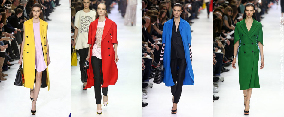Christian Dior to bardzo klasyczna kolekcja z nowoczesnymi formami. Bazą są dwurzędowe płaszcze, rozkloszowane sukienki i spódnice oraz baskinka o ciekawej konstrukcji. Ekstrawagancki motyw pojawia się w postaci energetycznych, intensywnych zestawień czyli color blocking. Jest to jeden z trudniejszych trendów, który wymaga dobrego wyczucia kolorów. Jego podstawową zasadą jest łączenie kontrastujących ze sobą kolorów w różnych tonacjach, które na pozór do siebie nie pasują. Dom mody zadbał również o neonowe dodatki w postaci torebek i butów. Balmain w swojej kolekcji zaproponował odważne, neonowe futra zestawione z wzorzystą tkaniną. Kolejną propozycją są również pomarańczowe i cytrynowe sukienki z ciekawą fakturą. Neonowe barwy od podszewki? Takie projekty zaprezentował Joseph Altuzarra, którego kolekcja zachwyca kobaltowymi i fuksjowymi kołnierzami oraz paskami zawiązanymi na linii talii. Ralph Lauren postawił na jeden mocny, neonowy akcent w postaci kurtki, sweterka czy płaszcza. Tłem jest czarna baza. Kenzo zachwyca geometrycznymi formami oraz abstrakcyjnymi wzorami w wydaniu fluorescencyjnym. Cała kolekcja jest oparta na kontrastujących barwach.
