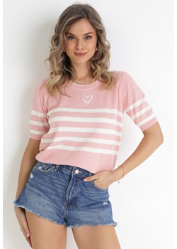 Różowa Dzianinowa Bluzka z Wiskozy Ozdobiona Serduszkiem i Paskami Samana