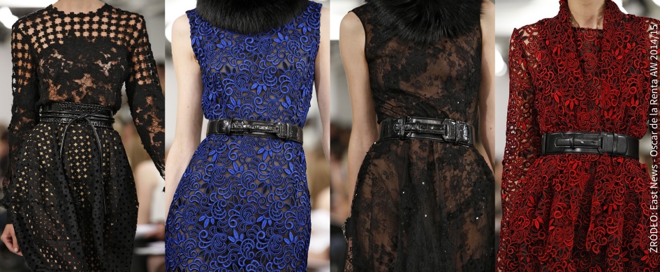 W tym sezonie wielu projektantów w swoich kolekcjach zaprezentowało koronkowy motyw w czarnej wersji. Na światowych wybiegach obserwujemy finezyjne koronki, zestawione z ciężkimi, mięsistymi tkaninami. Taką tendencję możemy zauważyć na pokazie Milly. Dolce & Gabbana ten delikatny motyw łączy z futrzanymi dodatkami. Alberta Ferreti stawia na jedwabne przeźroczystości, a Elie Saab wybrał koronkowe, długie suknie, idealne na specjalne okazje. Alternatywę dla czarnej koronki zaproponował Oscar de la Renta oraz Giambattista Valli. Na pokazie możemy zaobserwować kolorowe, koronkowe płaszcze i sukienki.
