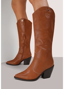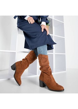Brązowe damskie kozaki na słupku z eko-zamszu Celestyna - Obuwie