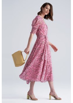 Sukienka dopasowana kopertowy dekolt ozdobne rękawki AISZA pudrowy róż