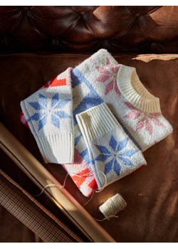 Wskazówka: sweter w norweski wzór będzie pasował nie tylko do niebieskich jeansów. Dobrym pomysłem będą także spodnie w kolorze złamanej bieli czy beżu.